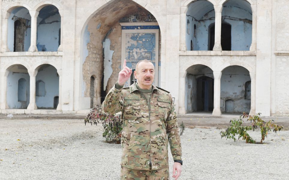 Biz müharibə dövründə də özümüzü ləyaqətlə aparmışıq və müharibənin bütün qaydalarına riayət etmişik. Məhz buna görə Ermənistan tərəfində mülki vətəndaşlar arasında itkilər həddindən artıq azdır. Biz ancaq işğalçı orduya qarşı mübarizə aparmışıq, müharibə aparmışıq. Dinc əhaliyə qarşı heç vaxt müharibə aparmamışıq. Ermənilərdən fərqli olaraq, soyqırımı törətməmişik və digər hərbi cinayətlər törətməmişik. Ancaq ermənilərin törətdikləri cinayətlər artıq bütün dünyaya bəllidir: Xocalı soyqırımı, digər kəndlərimizin sakinlərinin qətlə yetirilməsi, şəhərlərimizin dağıdılması. Baxın, görün, Ağdam şəhəri yoxdur, yoxdur. Bir bina da yoxdur. Bir Cümə məscidinin qalıqları qalıb. Onu da mən demişəm, onlar iki məqsəd üçün saxlamışdılar. Bir məqsəd o torpağa bağlı olan bir işarə idi. Yəni artilleriya atəşinin tənzimlənməsi üçün lazım idi bu məntəqə, bu obyekt. İkinci məqsəd müşahidə məntəqəsi idi. Məscidin minarələrindən onlar müşahidə edirdilər. İndi mən müharibədən sonra Ağdama ikinci dəfə səfər edirəm. Birinci dəfə Ağcabədi istiqamətindən gəldim. Bu dəfə isə Bərdə istiqamətindən gəldim. Hər iki istiqamət üzrə bir neçə müdafiə xətti var, istehkamlar var. Cümə məscidinin qalıqlarından başqa, bir dənə də salamat bina yoxdur. Bunu hansısa yadplanetli, necə deyərlər, ünsürlər törətməyiblər. Bunu bizim qonşumuz olan, bizim çörəyimizi yeyən, bizim torpağımızda özünə yuva salan, ancaq bizə qarşı daim nifrət hissi ilə yaşayan ermənilər törədiblər. Bu dağıntılar Birinci Qarabağ müharibəsindən sonra törədildi. Bu, ikinci müharibə dövründə törədilən dağıntılar deyil. Bizim bütün maddi sərvətimiz məqsədyönlü şəkildə dağıdıldı, talan edildi. Tarixi-dini abidələrimiz söküldü. Bunun da bir neçə məqsədi var idi. Birincisi, bizə olan nifrət. İkincisi, Azərbaycan xalqının mədəni irsini bu torpaqlardan silmək məqsədi və əlbəttə ki, gələcəkdə elə bir vəziyyət yaratmaq ki, Azərbaycan əhalisi bu torpaqlara qayıda bilməsin.