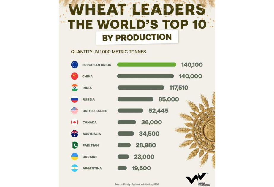 AZƏRTAC xəbər verir ki, Avropa İttifaqı və Çin, hər biri təxminən 140 milyon ton buğda istehsal edərək birinci yeri bölüşüb və bu sahədə özlərini qlobal liderlər kimi möhkəmləndirib.