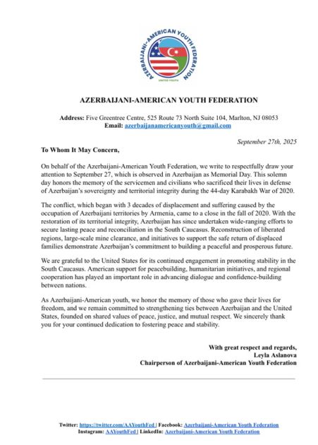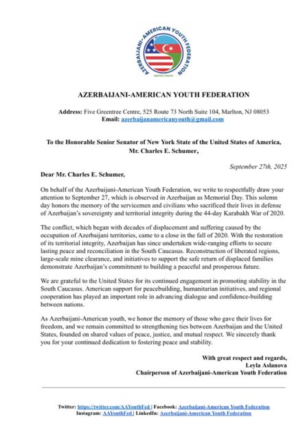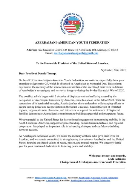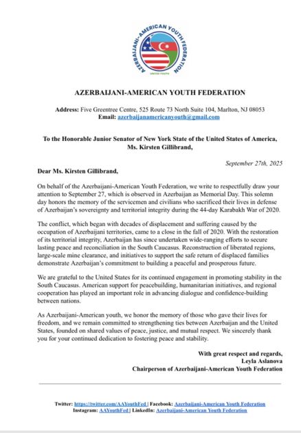 ABŞ-ın Nyu-York şəhərində fəaliyyət göstərən Azərbaycan-Amerika Gənclər Federasiyası 27 Sentyabr – Anım Günü ilə əlaqədar məlumatlandırıcı məktub kampaniyası həyata keçirib.