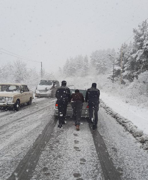 Daxili İşlər Nazirliyinin mətbuat xidmətinin Şəki regional qrupundan bildirilib ki, sürücülərin təhlükəsiz hərəkətini təmin etmək məqsədilə zəruri tədbirlər həyata keçirilir. Nəqliyyatın hərəkəti polis əməkdaşları tərəfindən tənzimlənir, sürücülərlə profilaktik iş aparılır və onlara yollardakı vəziyyət barədə məlumat verilir. Vətəndaşlara köməklik göstərilir, onların mənzil başına təhlükəsiz şəkildə çatmaları təmin olunur. Yol patrul xidməti avtomobillərinin müşayiəti ilə aidiyyəti qurumların əməkdaşları tərəfindən əraziyə qum və duz səpilir, təhlükəsizlik tədbirləri davam etdirilir.