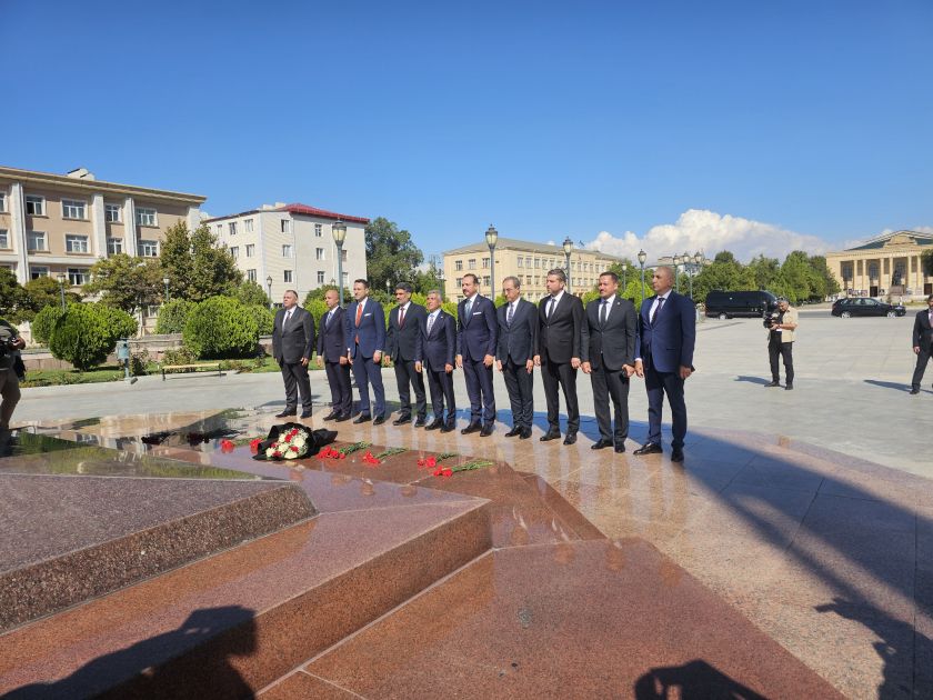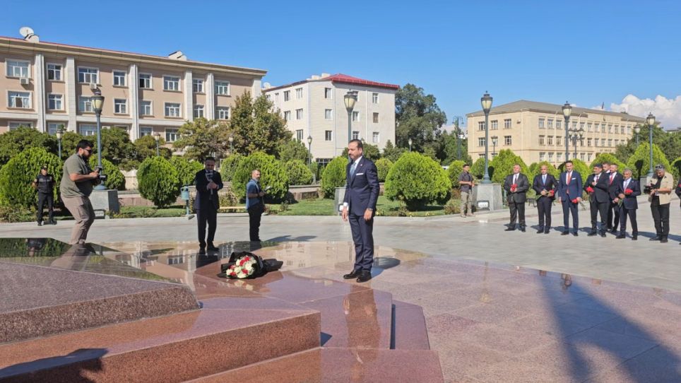 AZƏRTAC-ın bölgə müxbiri xəbər verir ki, səfər çərçivəsində nümayəndə heyəti Ümummilli Liderimiz Heydər Əliyevin Naxçıvan şəhərinin baş meydanında ucalan abidəsini ziyarət edib, abidə önünə gül dəstələri düzüblər.