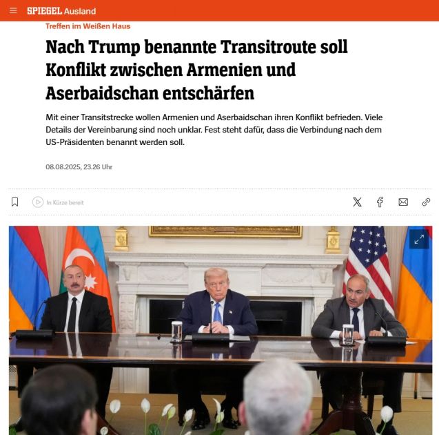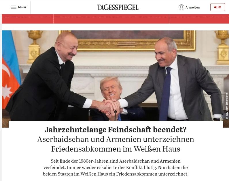 Almaniyanın bir sıra nüfuzlu media orqanları Azərbaycan Prezidenti İlham Əliyevin və Ermənistanın Baş naziri Nikol Paşinyanın ABŞ Prezidenti Donald Trampın dəvəti ilə Vaşinqtonda keçirilən görüşü və əldə olunan mühüm razılaşmaya geniş diqqət yetirib.