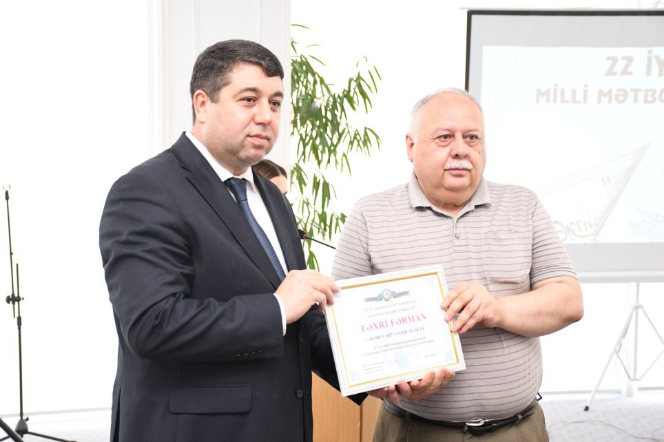 Sonra 22 İyul - Milli Mətbuat Günü münasibətilə bir qrup jurnalistə. o cümlədən "Azərbaycan" qəzetinin 4 əməkdaşına fəxri fərman təqdim edilib.