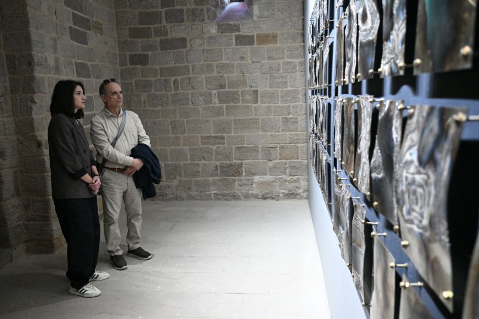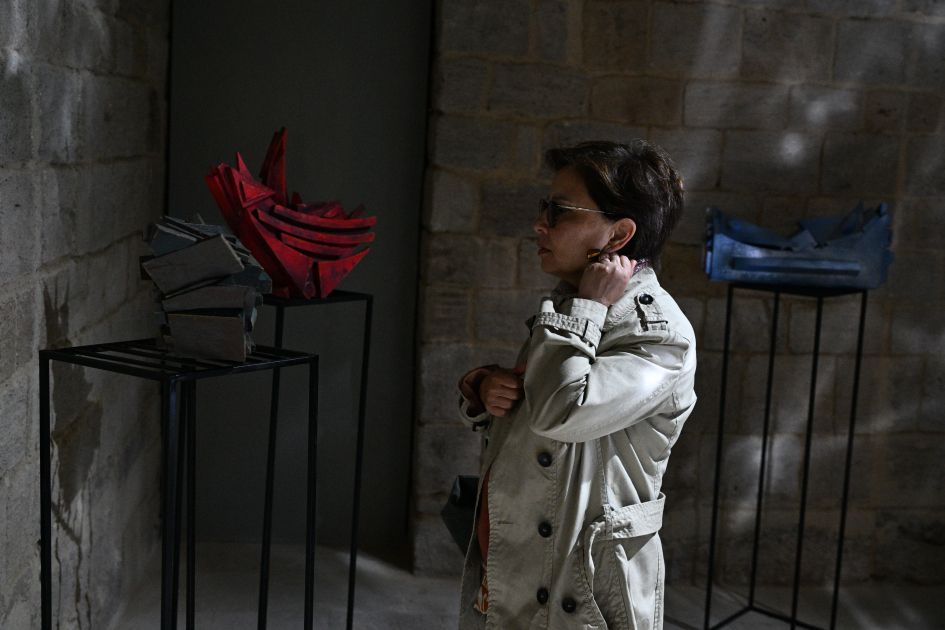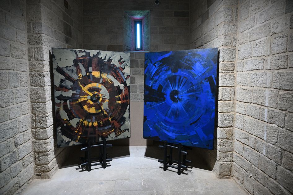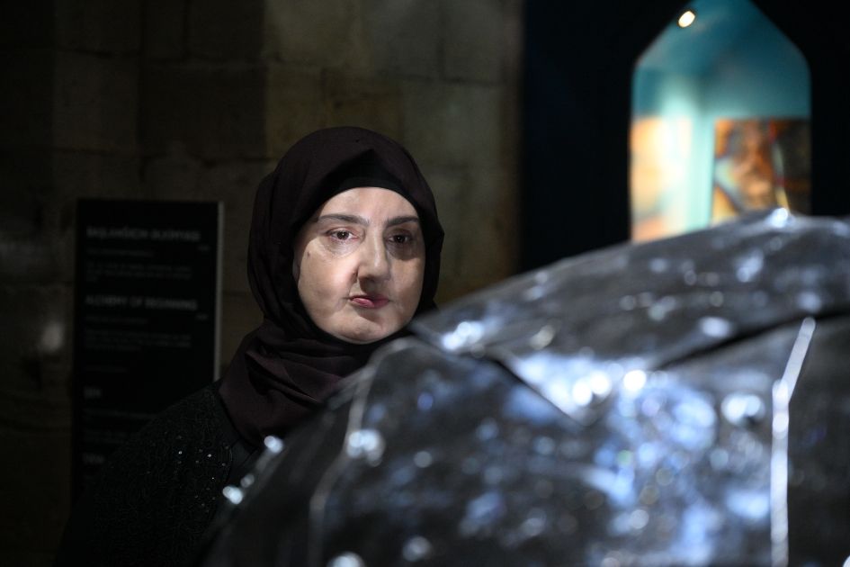 Sərgidə rəssam Vüsalə Ağarəziyeva Şirvanşahlar Sarayını gecə ilə sübh arasındakı o incə, düşüncəli məqama çevrilən kontemplativ bir məkana bənzədir.