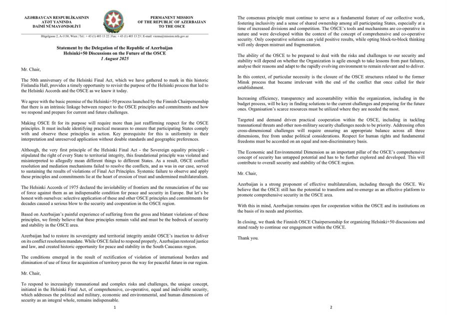 “ATƏT-ə sədrlik edən Finlandiya tərəfindən Helsinki Yekun Aktının 50-ci ildönümünə həsr olunmuş “Helsinki+50” konfransı bir daha təsdiq edib ki, ATƏT-in prinsipləri qüvvədə qalır və ATƏT regionunda təhlükəsizlik və sabitliyin əsası olmalıdır".