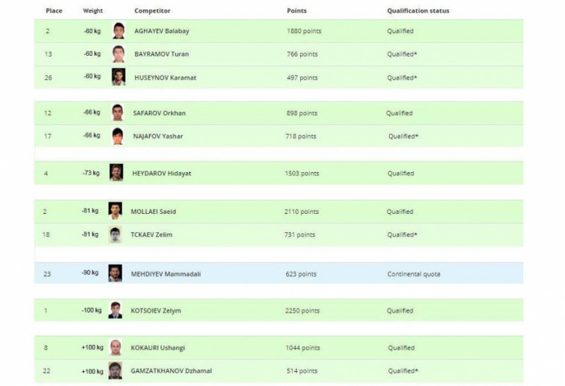 AZƏRTAC xəbər verir ki, Olimpiya reytinq cədvəlinə əsasən Zelim Kotsoyev (100 kq) ilk sırada yer alıb. Balabəy Ağayev (60 kq) və Səid Mollayi (81 kq) ikinci yerdə qərarlaşıb. Hidayət Heydərov (73 kq) dördüncü pillədədir.