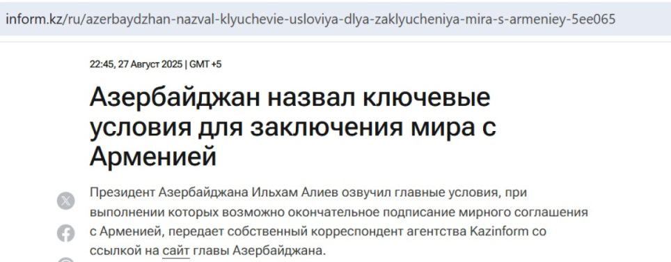 AZƏRTAC xəbər verir ki, “Kazinform” beynəlxalq informasiya agentliyi “Azərbaycan Ermənistanla sülhün bağlanması üçün əsas şərtləri açıqlayıb” sərlövhəli məqalə dərc edib.