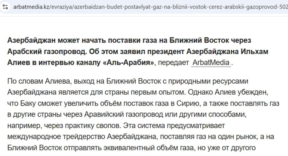 “Arbatmedia.kz” nəşri dövlətimizin başçısına istinadla yazır ki, Azərbaycan Yaxın Şərqə qaz tədarük edəcək. Materialda qeyd olunur ki, Azərbaycan Prezidenti müsahibəsində vurğulayıb: “Sözsüz ki, təbii ehtiyatlarımızla Yaxın Şərqə daxil olmaq bizim üçün ilk təcrübədir”.
