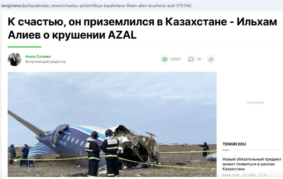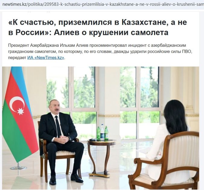 Qazaxıstanın “Inbusiness.kz”, “Tengrinews.kz”, “Newtimes.kz” media orqanlarının dərc etdiyi məqalələrdə AZAL-a məxsus təyyarənin Aktau yaxınlığında qəzaya uğraması ilə bağlı Azərbaycan Prezidentinin fikirləri yer alıb. Materiallarda dövlətimizin başçısına istinadla qeyd olunur ki, Azərbaycan mülki təyyarəsinin Rusiya qüvvələri tərəfindən vurulması və Rusiya rəsmilərinin hadisəyə reaksiyası Azərbaycanda böyük məyusluq və narazılıq yaradır. Prezident İlham Əliyevin aşağıdakı sözləri sitat gətirilir: “Yalnız pilotların peşəkarlığı və cəsarəti təyyarəni yerə endirməyə imkan verdi. Xoşbəxtlikdən təyyarə Rusiyada deyil, Qazaxıstanda eniş etdi”.