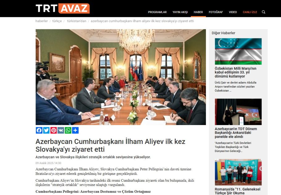 “TRT Avaz”ın saytında dərc olunan “Azərbaycan-Slovakiya münasibətləri strateji tərəfdaşlıq səviyyəsinə yüksəlir” sərlövhəli yazıda görüşlər zamanı enerji təchizatı təhlükəsizliyi, müdafiə sənayesi, nəqliyyat və Ağdam rayonunun “ağıllı kənd” konsepsiyası əsasında yenidən qurulması kimi istiqamətlərdə əməkdaşlıq imkanlarının müzakirə olunduğu qeyd edilib. Vurğulanıb ki, Prezident Pelleqrini Azərbaycanın uzunmüddətli strateji tərəfdaş kimi rolunu vurğulayıb, Prezident Əliyev isə qaz tədarükünü genişləndirməyə, həmçinin Slovakiya texnologiyası ilə Azərbaycanın maliyyə imkanlarını birləşdirərək yeni müdafiə və infrastruktur layihələrini həyata keçirməyə hazır olduqlarını bildirib.