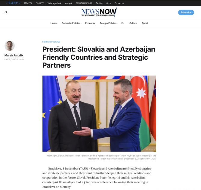 “Oksigen” qəzetinin məqaləsində bildirilib ki, Prezident İlham Əliyevin Prezident Peter Pelleqrini ilə görüşündə enerji təhlükəsizliyində Azərbaycanın strateji rolu və müdafiə sənayesi sahəsində birgə layihələrin perspektivləri müzakirə olunub. Slovakiya Lideri ölkəsinin enerji mənbələrinin şaxələndirilməsində Azərbaycanın aparıcı rolunu vurğulayıb və birgə istehsal olunacaq müdafiə məhsullarının üçüncü ölkələrə satış imkanlarına diqqət çəkib.