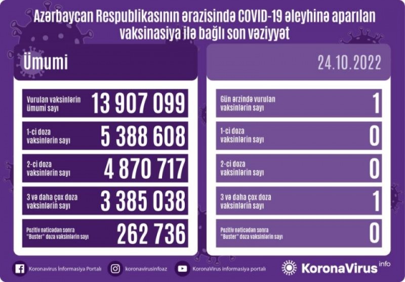 Oktyabrın 24-də Azərbaycanda yeni növ koronavirus (COVID-19) infeksiyası əleyhinə 1 doza vaksin vurulub.