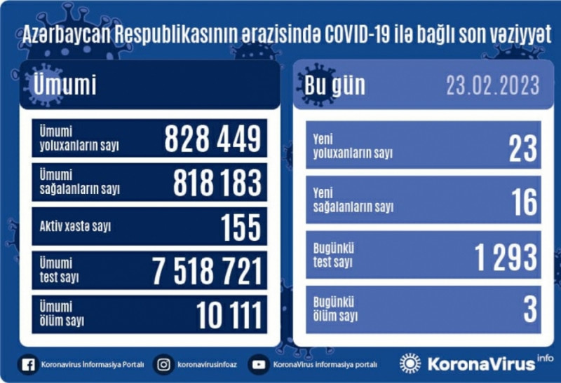 Fevralın 23-də Azərbaycanda yeni növ koronavirus (COVID-19) infeksiyasına 23 yoluxma faktı qeydə alınıb, 16 nəfər müalicə olunaraq sağalıb.