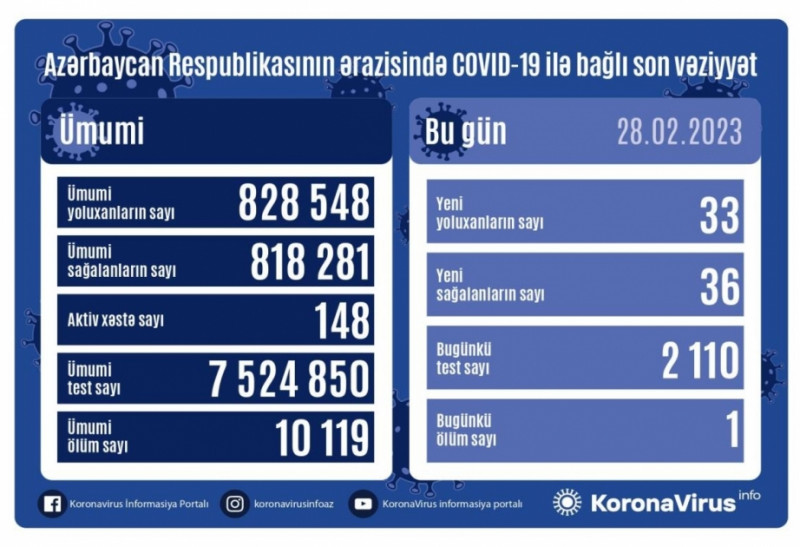 Fevralın 28-də Azərbaycanda yeni növ koronavirus (COVID-19) infeksiyasına 33 yoluxma faktı qeydə alınıb, 36 nəfər müalicə olunaraq sağalıb.
