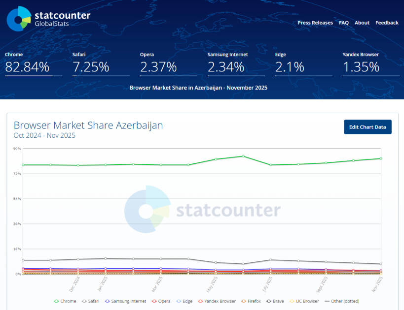 Azərbaycanda 2025-ci ilin noyabr ayında ən populyar brauzer 81,26 faiz payla “Chrome” olub, onun ardınca 7,25 faizlə “Safari” və 2,37 faizlə “Opera” gəlir. Daha sonra “Samsung Internet” (2,34 faiz), “Edge” (2,1 faiz) və “Yandex Browser” (1,35 faiz) gəlir. Bütün platformalar üzrə (stolüstü və mobil cihazlar) statistika “Chrome”un böyük fərqlə lider olduğunu göstərir.