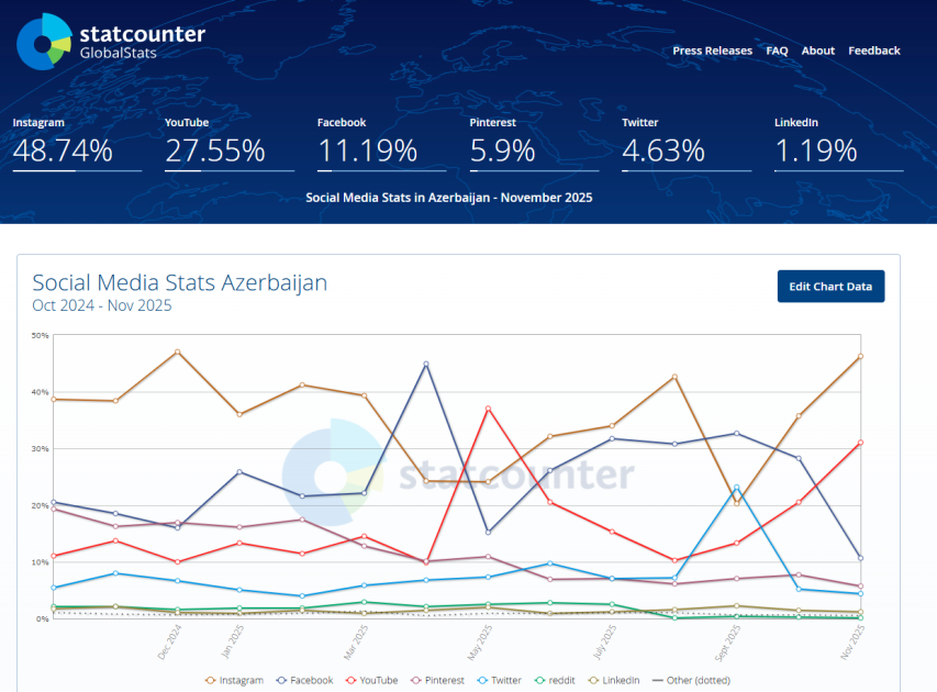 “StatCounter”in məlumatına görə, bu ilin noyabr ayında Azərbaycandakı sosial media platformalarının ümumi seqmentində (kompüterlər, mobil cihazlar və planşetlər) “Instagram”ın payı 48,74 faiz təşkil edib (oktyabrda – 35,77 faiz). İkinci yerdə qərarlaşan “YouTube”un bazar payı 31,04 faiz olub. Növbəti yerdə qərarlaşan “Facebook”un bazar payı 10,68 faiz təşkil edib. Dördüncü yerdə olan “X”in bazar payı isə 4,46 faiz olub. Beləliklə, onun bazar payı bir ay ərzində 77 faiz azalıb. Beşliyi 5,7 faiz bazar payı ilə “Pinterest” tamamlayır.