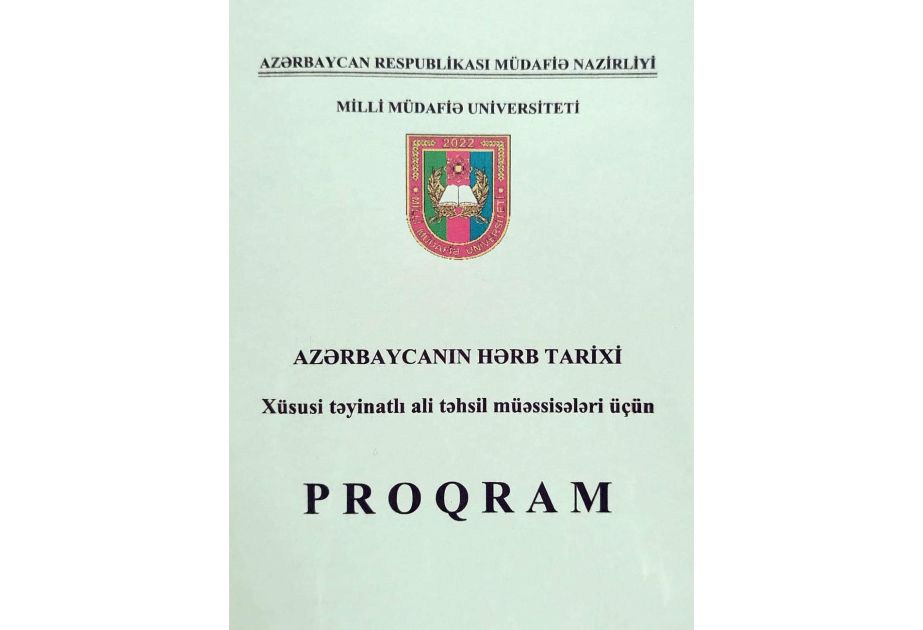 “Azərbaycanın hərb tarixi” proqramı işıq üzü görüb. Ölkəmizin ali, humanitar və xüsusi təyinatlı ali təhsil müəssisələri üçün nəzərdə tutulan proqram Milli Müdafiə Universitetinin Hərbi Elmi Tədqiqat İnstitutunda hazırlanıb. Proqramın tərtibatçıları həmin institutun professoru, tarix elmləri doktoru Nurulla Əliyev və tarix üzrə fəlsəfə doktoru Nərminə Əmirbəyova, elmi redaktor tarix üzrə fəlsəfə doktoru Səbuhi Əhmədov, redaktor isə siyasi elmlər üzrə fəlsəfə doktoru Qaşqay Ramazanovdur.