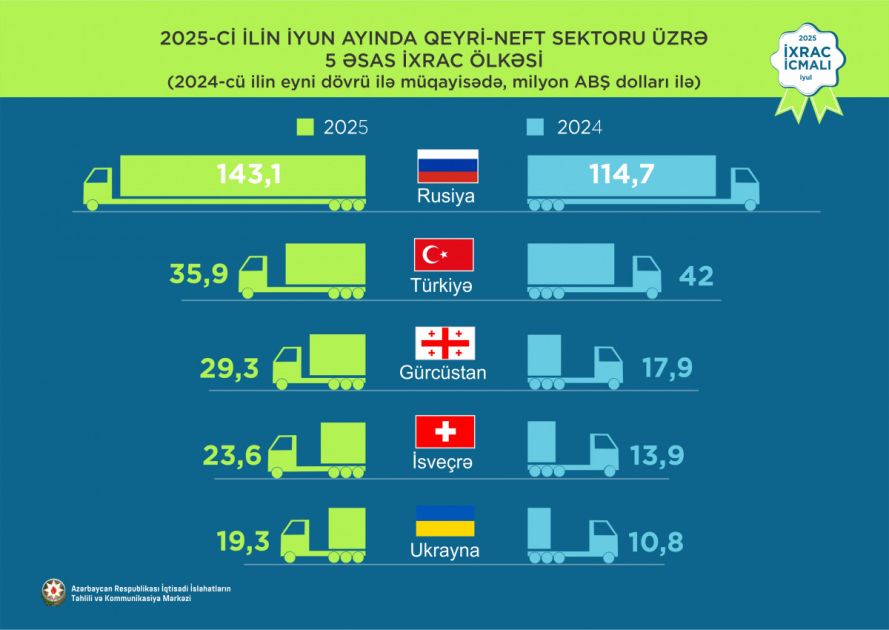 2025-ci ilin iyun ayında Rusiyaya 143,1 milyon dollar, Türkiyəyə 35,9 milyon dollar, Gürcüstana 29,3 milyon dollar, İsveçrəyə 23,6 milyon dollar, Ukraynaya isə 19,3 milyon dollar dəyərində qeyri-neft sektoruna aid mal ixrac edilib.