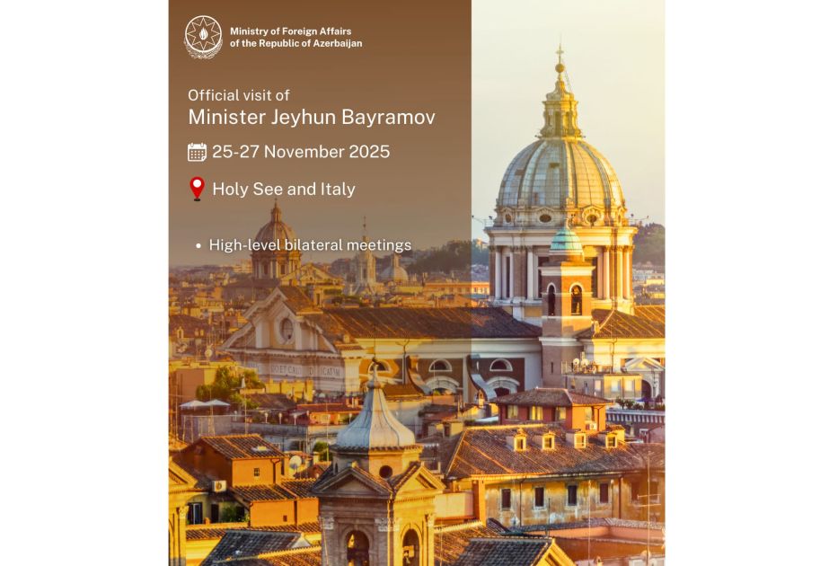 Xarici İşlər Nazirliyinin Mətbuat xidməti idarəsindən AZƏRTAC-a bildirilib ki, səfər çərçivəsində noyabrın 25-27-də nazir Ceyhun Bayramovun Vatikanda və İtaliyada xarici işlər nazirləri, digər yüksəksəviyyəli rəsmilərlə görüşləri, beyin mərkəzində çıxışı və digər tədbirlərin keçirilməsi nəzərdə tutulur.