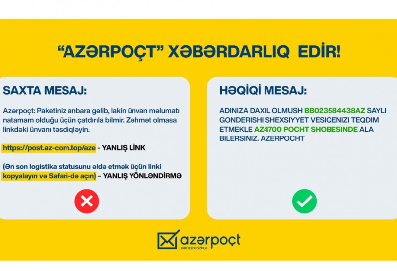 Belə ki, son zamanlar vətəndaşlara “Azərpoçt”un adından kütləvi şəkildə saxta mesajlar göndərilir, həmin mesajlarda vətəndaşların bağlamasının ölkəyə daxil olduğu, amma guya ev ünvanının natamamlığı səbəbindən mənzilə çatdırılmadığı qeyd olunur və elə həmin mesajda da saxta link göndərilir ki, ünvan və digər fərdi məlumatlar vətəndaş tərəfindən daxil edilsin.