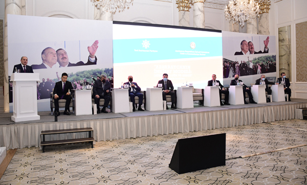 Sonra konfransda çıxış edən YAP Sədrinin müavini-Mərkəzi Aparatın rəhbəri Tahir Budaqov bildirib ki, bu gün Azərbaycan dünyada nümunəvi inkişaf modelinə və örnək milli tərəqqi yoluna malik müstəqil ölkə kimi tanınır. Ölkəmizin tarixi nailiyyətlər qazanaraq dünyada söz və nüfuz sahibinə çevrilməsi milli maraqlara, dövrün tələblərinə və çağırışlarına əsaslanan daxili və xarici siyasətin həyata keçirilməsi sayəsində mümkün olub. Müstəqillik dövrünün sabitlik və inkişaf mərhələsi kimi səciyyələndirilən 1993-2003-cü illərdə Ulu Öndər Heydər Əliyevin rəhbərliyi ilə görülən işlər milli-strateji hədəflərə çatmağa imkan verməklə yanaşı, yeni Azərbaycanın parlaq gələcəyini inşa etdi. Ulu Öndər həmçinin siyasi varisliyi təmin etməklə Azərbaycanın müstəqil dövlətçilik ənənəsinin qorunmasına - ölkəmizin suveren dövlət kimi davamlı inkişafına müstəsna töhfələr verib. Bu gün Azərbaycanın inamlı, dinamik və dayanıqlı inkişafı, müstəqilliyini möhkəmləndirərək yeni strateji zirvələr fəth etməsi Heydər Əliyev siyasətini yeni müstəvidə davam etdirən dünyaşöhrətli siyasətçi Prezident İlham Əliyevin adı ilə bağlıdır. Ümumiyyətlə, Prezident İlham Əliyevin adı həm daxili, həm də beynəlxalq ictimai rəydə milli tərəqqi anlayışı ilə assosiasiya olunur. Ona görə ki, Prezident İlham Əliyevin ölkəmizə rəhbərlik etdiyi son 18 ildə Azərbaycan misilsiz tərəqqiyə nail olub, nümunəvi iqtisadi inkişaf modeli ilə dünyanın diqqətini özünə cəlb edə bilib. Heç də təsadüfi deyil ki, dünyanın nüfuzlu ekspertləri və mötəbər strateji tədqiqat mərkəzləri, aparıcı reytinq institutları Azərbaycanın inkişaf modelini mütərəqqi nümunə kimi səciyyələndirir və ölkəmizin gələcəyinə dair pozitiv rəy, nikbin proqnoz ifadə edirlər.