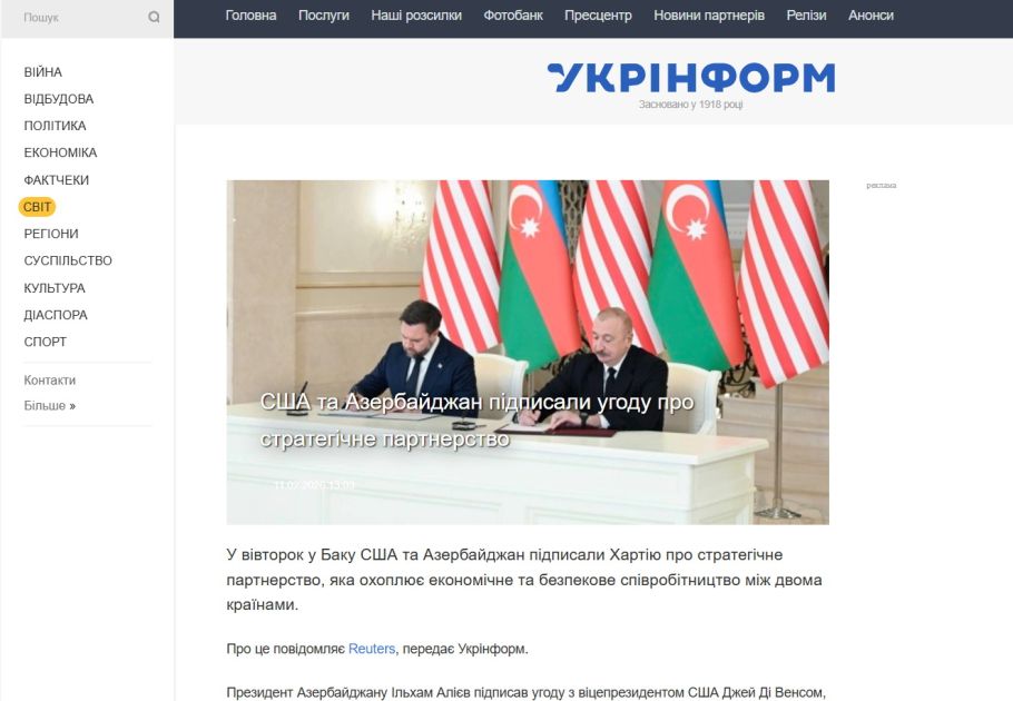 Ukrayna mediası ABŞ-ın Vitse-prezidentinin Azərbaycana səfərinə geniş yer ayırıb