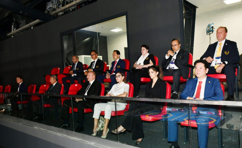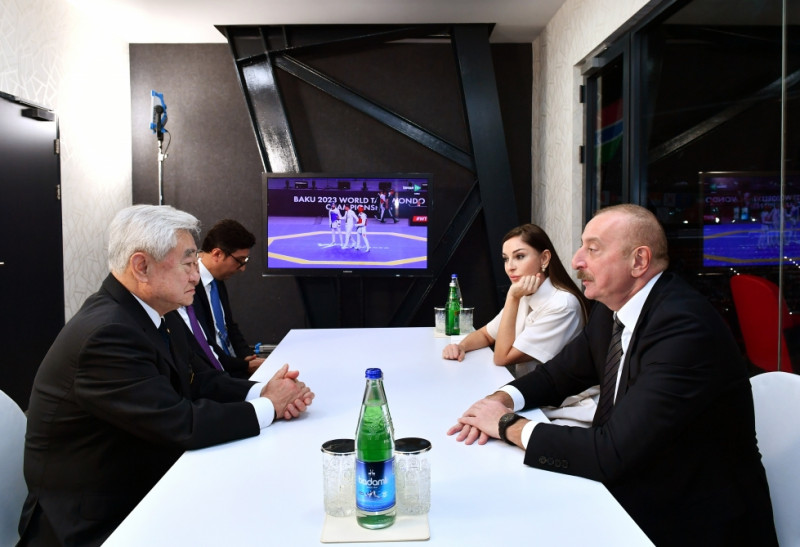 Əvvəlcə Prezident İlham Əliyev və birinci xanım Mehriban Əliyeva Dünya Taekvondo Federasiyasının prezidenti Çunqvon Çu ilə görüşdülər.