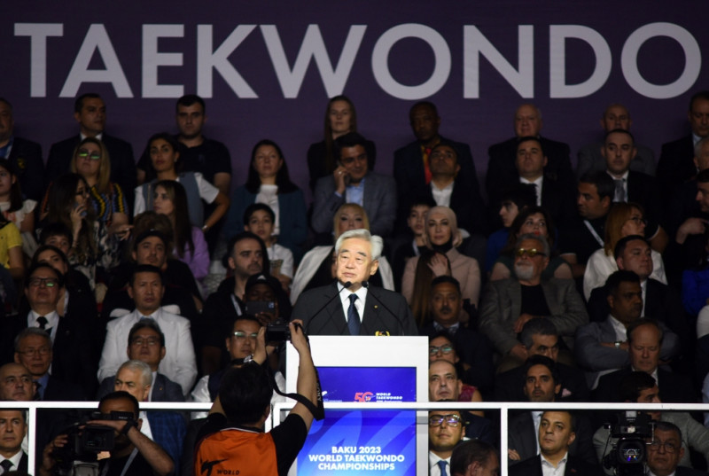 K.Heydərov 100 illik yubileyinin geniş qeyd olunduğu Ulu Öndər Heydər Əliyevin ölkəmizə rəhbərliyi dövründə idmana daim yüksək diqqət və qayğı göstərdiyini xatırlatdı. Bildirdi ki, bu siyasəti uğurla davam etdirən Azərbaycan Prezidenti İlham Əliyevin diqqət və qayğısı nəticəsində ölkəmizdə 50-yə yaxın Olimpiya İdman Kompleksi inşa olunub. Hazırda Azərbaycan beynəlxalq idman aləmində nüfuzlu idman ölkəsi kimi tanınır. Azərbaycanda irimiqyaslı yarışların təşkilinin artıq ənənəyə çevrildiyini, ölkəmizin dünya, Avropa çempionatlarına, I Avropa və IV İslam Həmrəyliyi oyunlarına uğurla ev sahibliyi etdiyini vurğulayan federasiya prezidenti dünya çempionatının təşkilini və Dünya Taekvondosunun 50 illiyinin qeyd olunmasını Azərbaycana həvalə etdiyi üçün Dünya Taekvondo Federasiyasının rəhbərliyinə təşəkkürünü bildirdi. O, həm iştirakçı ölkələrin, həm də idmançıların sayına görə rekord göstəricinin qeydə alındığı bu çempionatın Bakıda keçirilməsinin taekvondonun Azərbaycanda təbliği işinə böyük təkan verəcəyini dedi.