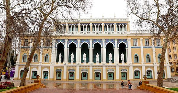 1943-cü ildə binanın fasadı və interyeri milli üslubda işlənərək eyvanında Azərbaycan ədəbiyyatının görkəmli nümayəndələrinin - Füzulinin (heykəltaraş: F.Əbdürrəhmanov), Vaqifin (C.Qaryağdı), M.F.Axundzadənin (heykəltaraş: P.Sabsay), Natavanın (heykəltaraş: E.Tripolskaya), C.Məmmədquluzadənin (heykəltaraş: N.Zaxarov), C.Cabbarlının (heykəltaraş: E.Klyatskin) heykəlləri ucaldılır.