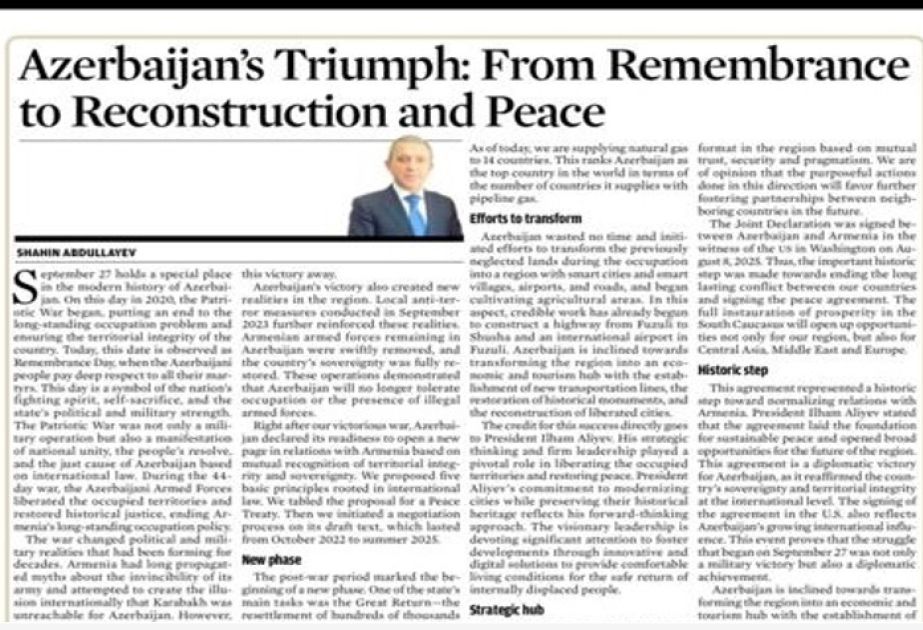 AZƏRTAC xəbər verir ki, məqalədə 2020-ci il sentyabrın 27-nin Azərbaycanın tarixində dönüş nöqtəsi olduğu bildirilir. Qeyd olunur ki, həmin gün başlayan 44 günlük Vətən müharibəsi ilə ölkəmizin ərazi bütövlüyü bərpa edilib və Ermənistanın uzun illər davam edən işğal siyasətinə son qoyulub.