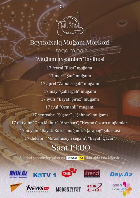 İlin sonuna kimi Beynəlxalq Muğam Mərkəzinin təşkilatçılığı ilə "Rast" , "Şur", "Zabul-Segah", "Çahargah", "Bayatı-Şiraz", "Humayun", "Şüştər", "Şahnaz", "Orta Mahur", "Arazbari", "Osmanlı", "Heydəri", "Bayatı Qacar", "Mahur hindi", "Qarabağ şikəstəsi", "Xaric segah", "Heyratı", "Mirzəhüseyn segahı", "Kəsmə şikəstə", "Bayatı Kürd" , "Ovşarı", "Dəşti", "Qatar", "Rahab", "Şirvan şikəstəsi" muğamları təqdim olunacaq.