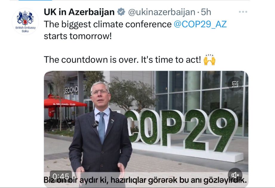 Böyük Britaniyanın Azərbaycandakı səfiri Fergus Auld X sosial media şəbəkəsində COP29 ilə bağlı paylaşım edib.