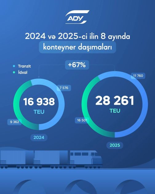 Analoji dövrdə bu qatarlarla 28 min 261 TEU konteyner yük daşınıb və ötən ilin eyni dövrü ilə müqayisədə 67 faiz artım qeydə alınıb.