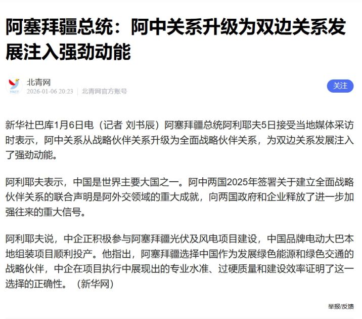 Sinxua Prezident İlham Əliyevin “Biz təkcə yaşıl energetikanı deyil, həm də yaşıl nəqliyyatı inkişaf etdirmək qərarına gəldikdə, gündəmdə strateji tərəfdaş seçmək məsələsi dayandı və Çin şirkətlərini seçdik” sitatını da xəbərə daxil edib.