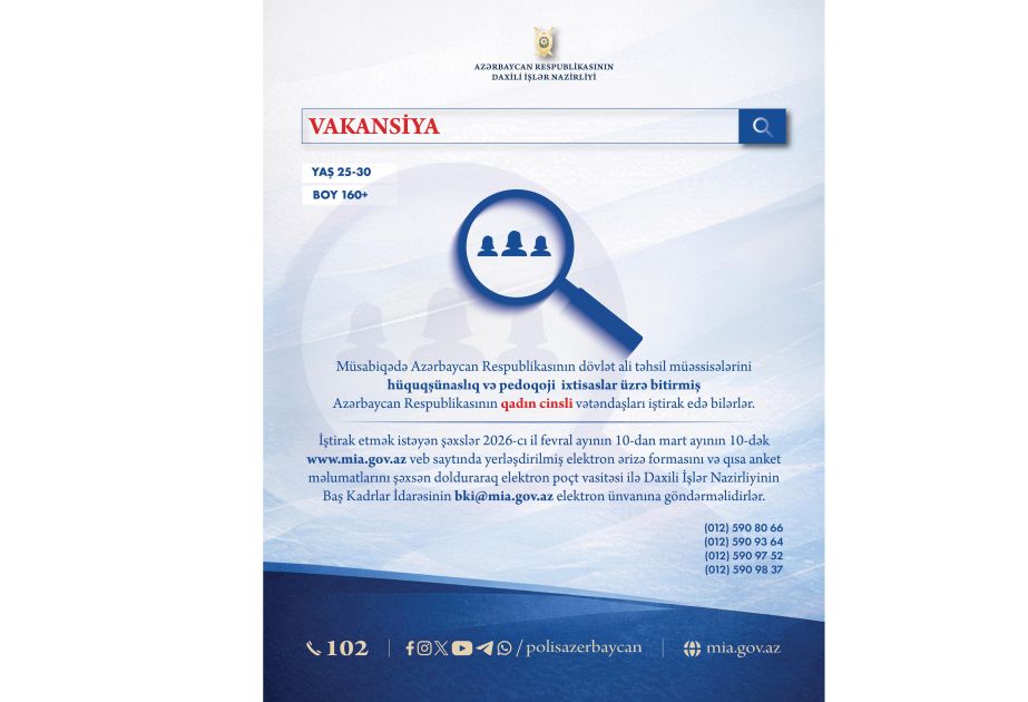 Daxili İşlər Nazirliyi (DİN) Bakı şəhərində yerləşən müvafiq qurumlarında, eləcə də respublikanın şəhər və rayon polis orqanlarında vakant olan yetkinlik yaşına çatmayanların işləri üzrə orta rəis heyəti üzrə inspektor vəzifələrinə qadın namizədlərin xidmətə qəbulunu elan edib.