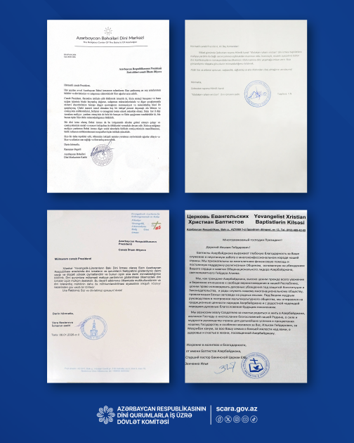 İsmayıllı rayonu İvanovka kəndi, Sumqayıt şəhər və Qobustan rayonu Hilmilli kəndi “Molokan-ruhani-xristian” dini icmaları, “Vineyard Azərbaycan”, “Şərqdə Ulduz”, “Həyat sözü”, Sumqayıt şəhəri “Həyat sözü-2” Xristian dini icmaları, Bakı şəhəri və Sumqayıt şəhəri Alov-Xristian dini icmaları tərəfindən dövlət başçısına ünvanlanan məktublarda dövlətin dini konfessiyaların fəaliyyətinə göstərdiyi dəstək yüksək qiymətləndirilib. Eyni zamanda, “Yeddinci Günün Adventistləri”, “Gəncə şəhəri Yeddinci Günün Adventistləri”, “Bakı şəhəri Yeni Apostol” xristian, Yevangelik xristian baptistlərin kilsəsi, Krişna Şüuru, Bakı şəhəri Yevangelist Məsihi Baptistlərinin “Aqape”, “Yeni Həyat” Xristian incil, Xilaskar Yevangelik Lüteranların Bakı dini icmaları və Azərbaycan Bəhailəri dini mərkəzi bu yanaşmanın cəmiyyətdə qarşılıqlı anlayış və tolerantlıq mühitini daha da möhkəmləndirdiyini qeyd ediblər.