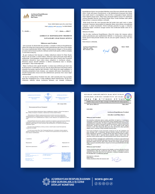 AZƏRTAC xəbər verir ki, məktublarda Prezident İlham Əliyevin imzaladığı “Azərbaycanda dini qurumlara maliyyə yardımı göstərilməsi haqqında” 2026-cı il 7 yanvar tarixli Sərəncam ölkəmizdə dövlət-din münasibətlərinin ardıcıl şəkildə inkişaf etdirilməsinin növbəti təzahürü kimi qiymətləndirilir. Sərəncama əsasən, dini qurumlara maliyyə yardımı göstərmək üçün Azərbaycan Respublikası Prezidentinin ehtiyat fondundan Qafqaz Müsəlmanları İdarəsinə 3,5 milyon manat, Rus Pravoslav Kilsəsinin Bakı və Azərbaycan Yeparxiyası dini qurumuna 400 min manat, Bakı şəhəri Dağ yəhudiləri dini icmasına 400 min manat, Avropa yəhudilərinin Bakı dini icmasına 400 min manat, Sefarad yəhudilərinin Bakı dini icmasına 400 min manat, Azərbaycan Respublikasında Katolik Kilsəsinin Apostol Prefekturası dini qurumuna 400 min manat və Azərbaycan Respublikasının Alban-Udi xristian dini icmasına 400 min manat, habelə digər qeyri-islam dini icmalarına maddi dəstək məqsədilə Azərbaycan Respublikası Dini Qurumlarla İş üzrə Dövlət Komitəsinin tabeliyində Mənəvi Dəyərlərin Təbliği Fonduna 400 min manat ayrılıb.