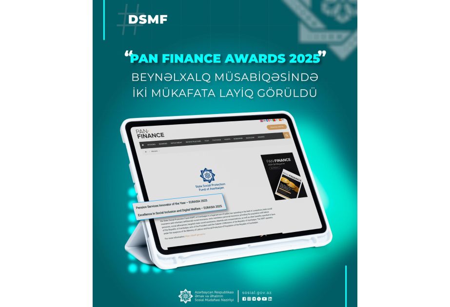 Əmək və Əhalinin Sosial Müdafiəsi Nazirliyinin tabeliyindəki Dövlət Sosial Müdafiə Fondu (DSMF) Birləşmiş Krallığın “Pan Finance” beynəlxalq maliyyə və biznes analizi platformasının “Pan Finance Awards 2025” beynəlxalq müsabiqəsində iki kateqoriya üzrə qaliblər sırasına daxil edilib.