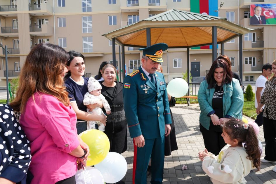 Hərbi qulluqçulara yeni xidməti mənzillərin orderlərini təqdim edən DSX-nin rəisi general-polkovnik Elçin Quliyev rəhbər heyət ilə birlikdə açılış mərasimindən sonra istifadəyə verilmiş yaşayış binalarında yaradılmış şəraitlə tanış olub.