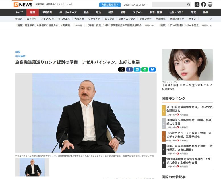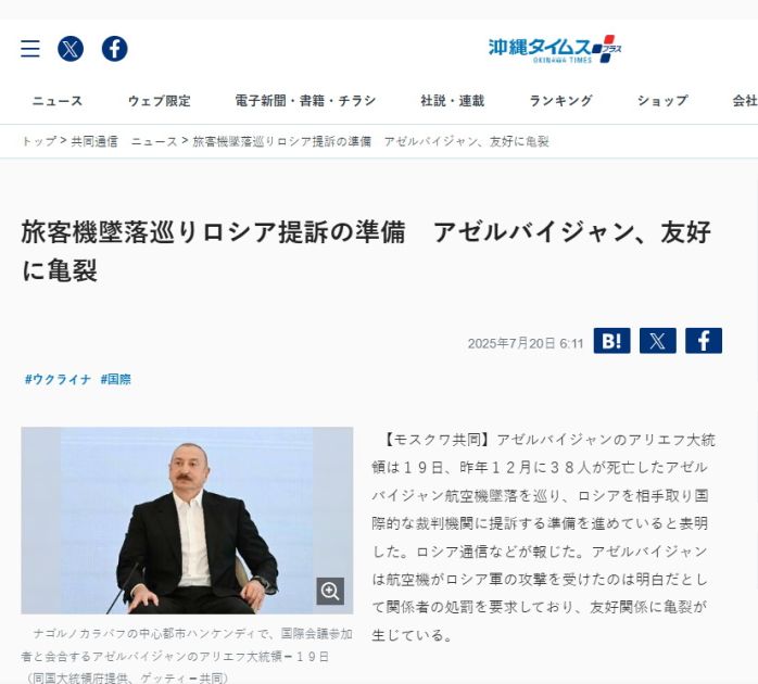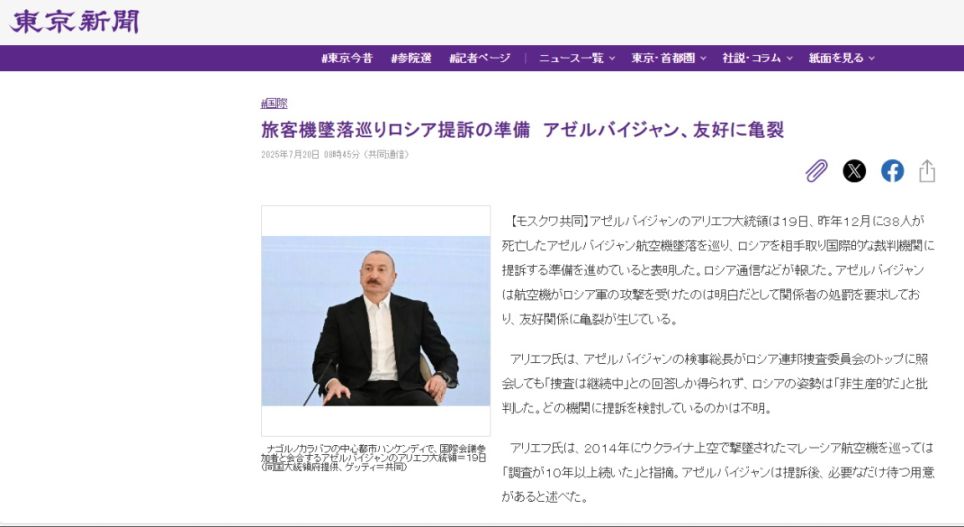 Yaponiya mətbuatı da Prezident İlham Əliyevin çıxışını geniş işıqlandırıb. Gündoğan ölkəsinin “Tokio-np”, “Newseveryday”, “Sankei Sinbun”, “Newspick”, “Okinawatimes”, “47News”, “Net Nihonkai” qəzet və portallarında Prezident İlham Əliyevin AZAL aviaşirkətinə məxsus təyyarənin Rusiya səmasında vurulması, bu insidentlə bağlı qarşı tərəfin hələ də heç bir məntiqli açıqlama verməməsi fikirləri yer alıb. Yapon mediasının xəbərlərində qeyd olunub ki, Azərbaycan dövlətinin başçısı Moskvanın həlak olanların ailələlərinə və yaralanan şəxslərə, həmçinin AZAL-ın təyyarəsinə görə təzminat ödəməsi tələbini irəli sürüb. Dövlətimizin başçısının aşağıdakı sözləri sitat gətirilir: “Biz artıq Rusiya tərəfini məlumatlandırmışıq ki, beynəlxalq ədliyyə sisteminə müraciət edəcəyik. Biz müəyyən bir qovluq hazırlayırıq. Bilirik ki, buna vaxt lazımdır. On il lazım oldu ki, Malayziya hava yollarına məxsus “Boeing”lə bağlı təhqiqat başa çatsın. Ancaq biz bu ədalətə nail olacağıq. Biz bunu əldə edəcəyik. Təəssüf ki, bugünkü vəziyyət ikitərəfli münasibətlərimiz baxımından heç də məqbul deyil”.