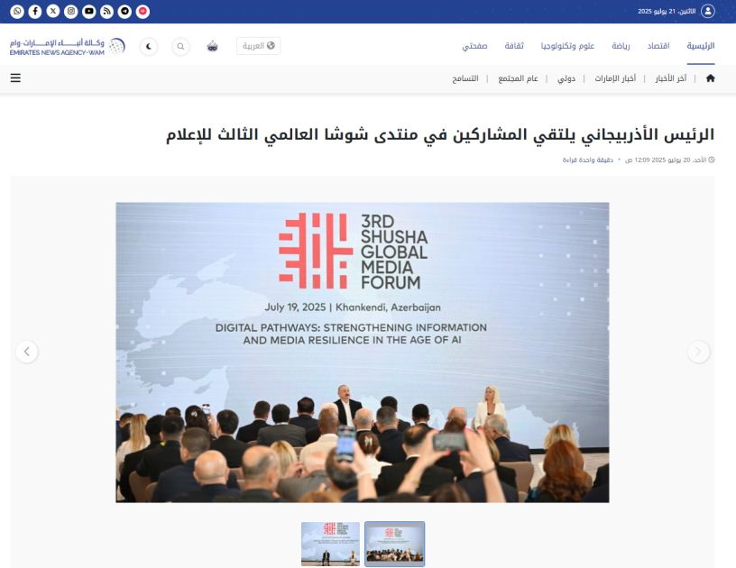 BƏƏ-nin “Şarjah24” qəzeti və rəsmi WAM xəbər agentliyində dərc olunan məqalələrdə Prezident İlham Əliyevin ABŞ-la qarşılıqlı fəaliyyətə dair bəyanatı ön plana çıxarılıb. Qeyd olunub ki, Azərbaycanın lideri Bakı ilə Vaşinqton arasında münasibətlərdə müsbət dinamikaya diqqət çəkib və Azərbaycan ilə Ermənistan arasında sülh prosesinin təşviqi istiqamətində göstərdiyi səylərə görə Donald Trampa təşəkkür edib. Yazılarda, həmçinin dövlətimizin başçısının beynəlxalq və regional münasibətlərlə, Əbu-Dabi görüşünün nəticələri ilə bağlı fikirləri də yer alıb.