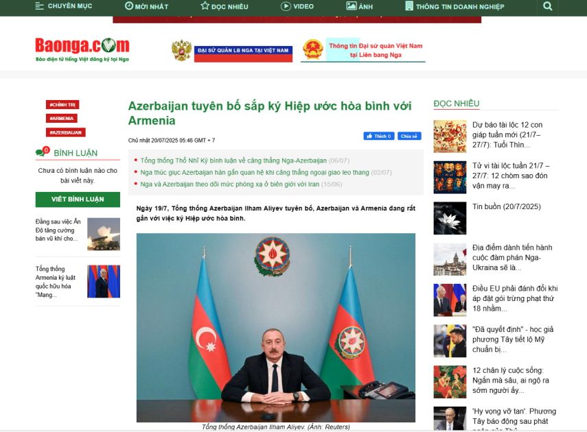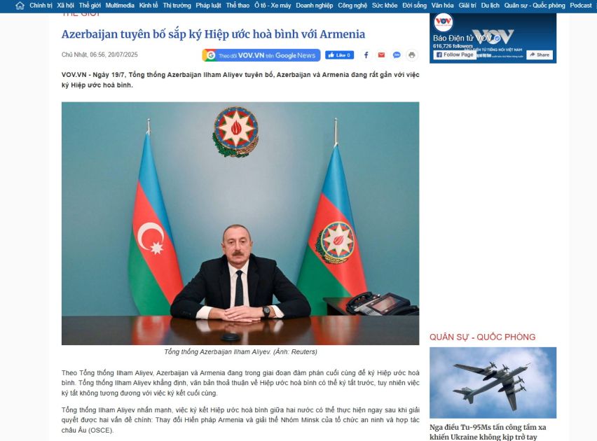 Vyetnamın “Vietnam-plus”, “Vnexpress”, “Laodong”, “Plo.vn”, “Vo.vn”, “Baonga” qəzet və portallarında dərc olunan materiallarda Prezident İlham Əliyevin Azərbaycanla Ermənistan arasında nizamlanma və sülh sazişinin imzalanmasına dair fikirləri yer alıb. Qeyd olunub ki, Azərbaycan dövlət başçısı Əbu-Dabidə keçirilən görüşün nəticələrini şərh edərkən bildirib ki, sülh sazişi Ermənistanın Azərbaycana qarşı ərazi iddialarının yer aldığı konstitusiyasında dəyişiklik və ATƏT-in Minsk qrupunun buraxılmasından sonra imzalana bilər. Materiallarda, həmçinin dövlətimizin başçısının AZAL-a məxsus təyyarənin vurulması, bu insidentlə bağlı Azərbaycanın mövqeyi haqqında fikirlərinə yer verilib.