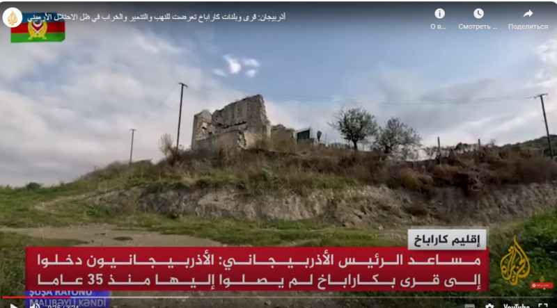 Qətərin nüfuzlu “Əl-Cəzirə” telekanalının efirində Qarabağla bağlı operativ reportajlar yayımlanır. AZƏRTAC xəbər verir ki, oktyabrın 3-də yayımlanan “Azərbaycan: Qarabağın kənd və şəhərləri erməni işğalı altında talan edilib, dağıdılıb və viran qoyulub” adlı reportajda Azərbaycan Respublikası Prezidentinin köməkçisi - Prezident Administrasiyasının Xarici siyasət məsələləri şöbəsinin müdiri Hikmət Hacıyevə istinadla ermənilərin 30 illik işğal dövründə Azərbaycanın bu qədim diyarının təbii, tarixi və mədəni sərvətlərinin talan etdiyi, mühüm infrastruktur obyektlərinin dağıtdıqları bildirilib.