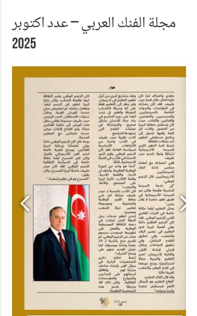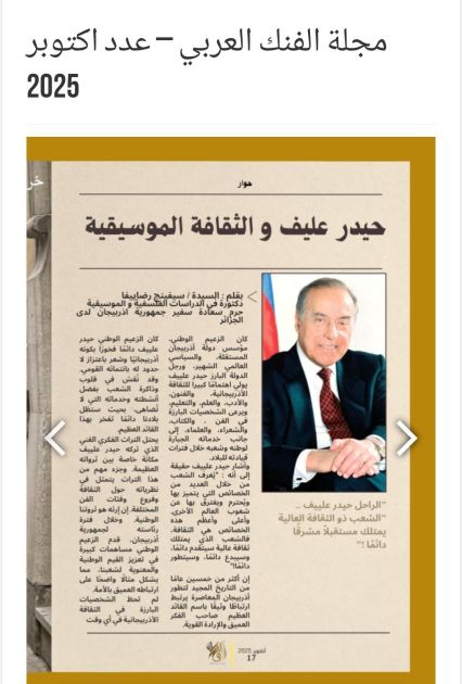 Əlcəzairin nüfuzlu “El Fanek El Arabi” jurnalında ərəb və ingilis dillərində Ümummilli Lider Heydər Əliyevin həyat və fəaliyyətinə həsr olunmuş geniş məqalə dərc edilib.