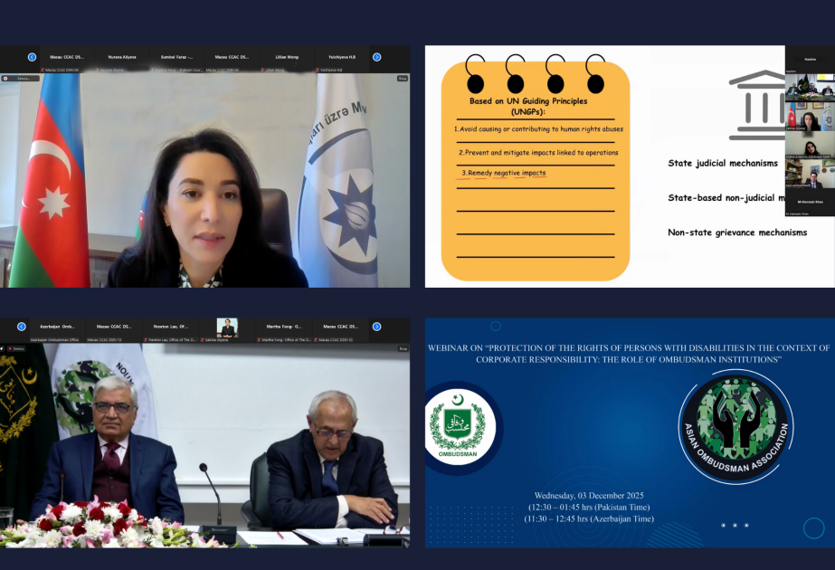 Beynəlxalq əməkdaşlıq fəaliyyəti çərçivəsində Azərbaycan Respublikasının insan hüquqları üzrə müvəkkili (ombudsman) Səbinə Əliyevanın təşəbbüsü əsasında Asiya Ombudsmanlar Assosiasiyası (AOA) ilə birgə 3 Dekabr – Əlilliyi olan Şəxslərin Beynəlxalq Gününə həsr edilmiş “Korporativ məsuliyyət kontekstində əlilliyi olan şəxslərin hüquqlarının müdafiəsi: Ombudsman institutlarının rolu” mövzusunda beynəlxalq vebinar keçirilib.