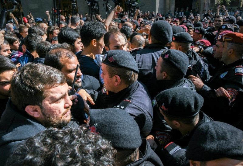 AZƏRTAC Ermənistan mediasına istinadla xəbər verir ki, polis İrəvandakı hökumət binasının yaxınlığında etirazçıları sərt şəkildə saxlamağa başlayıb, onlara qarşı güc tətbiq edilib. Magistral yollardan birini bağlayan nümayişçilər polis tərəfindən döyülüb.