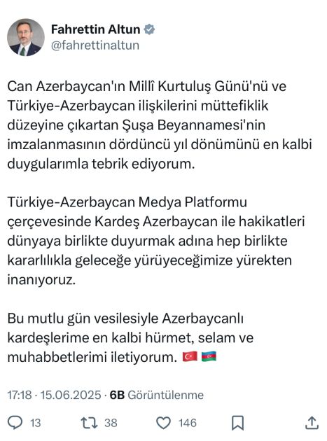 “Türkiyə-Azərbaycan media platforması çərçivəsində qardaş Azərbaycanla birlikdə həqiqətləri dünyaya çatdırmaq naminə birgə və qətiyyətlə gələcəyə addımlayacağımıza ürəkdən inanırıq. Bu əlamətdar gün münasibətilə azərbaycanlı qardaşlarıma ən səmimi hörmət, salam və sevgilərimi çatdırıram”- deyə Fahrettin Altun bildirib.