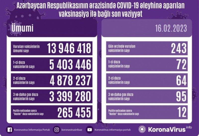 Fevralın 16-da Azərbaycanda yeni növ koronavirus (COVID-19) infeksiyası əleyhinə 243 doza vaksin vurulub.