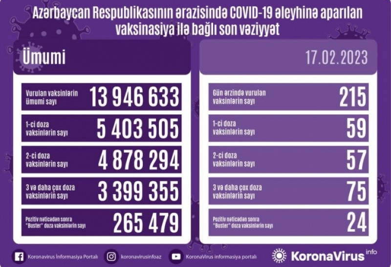 Fevralın 17-də Azərbaycanda yeni növ koronavirus (COVID-19) infeksiyası əleyhinə 215 doza vaksin vurulub.