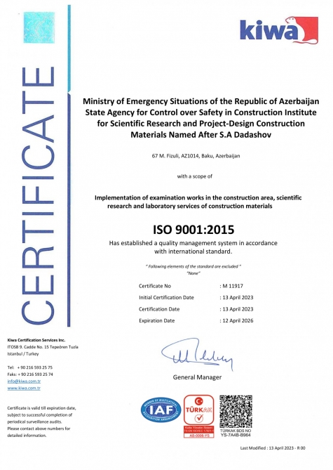 Fövqəladə Hallar Nazirliyinin (FHN) Tikintidə Təhlükəsizliyə Nəzarət Dövlət Agentliyinin S.Ə.Dadaşov adına Elmi-Tədqiqat və Layihə-Konstruktor İnşaat Materialları İnstitutu müvafiq təsisatlar tərəfindən beynəlxalq səviyyədə qəbul olunan ISO 9001 və ISO 37001 sertifikatlarına layiq görülüb.